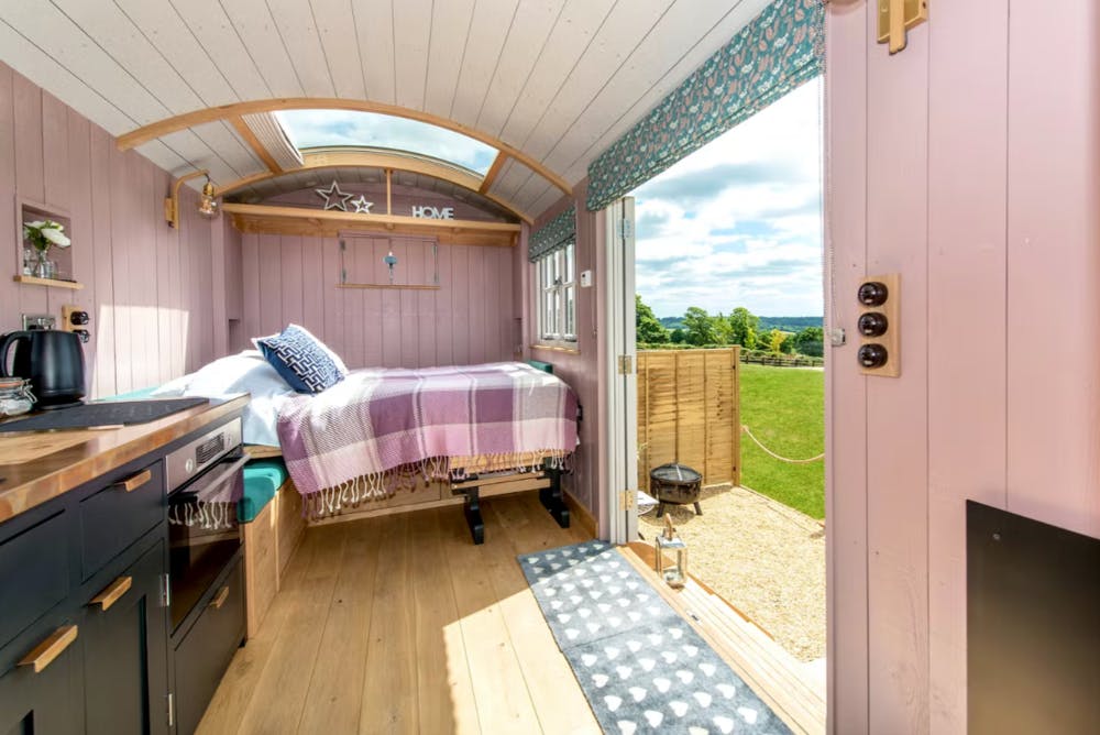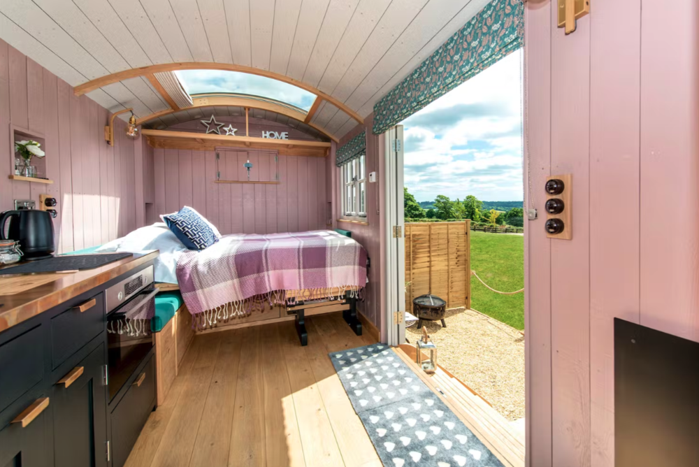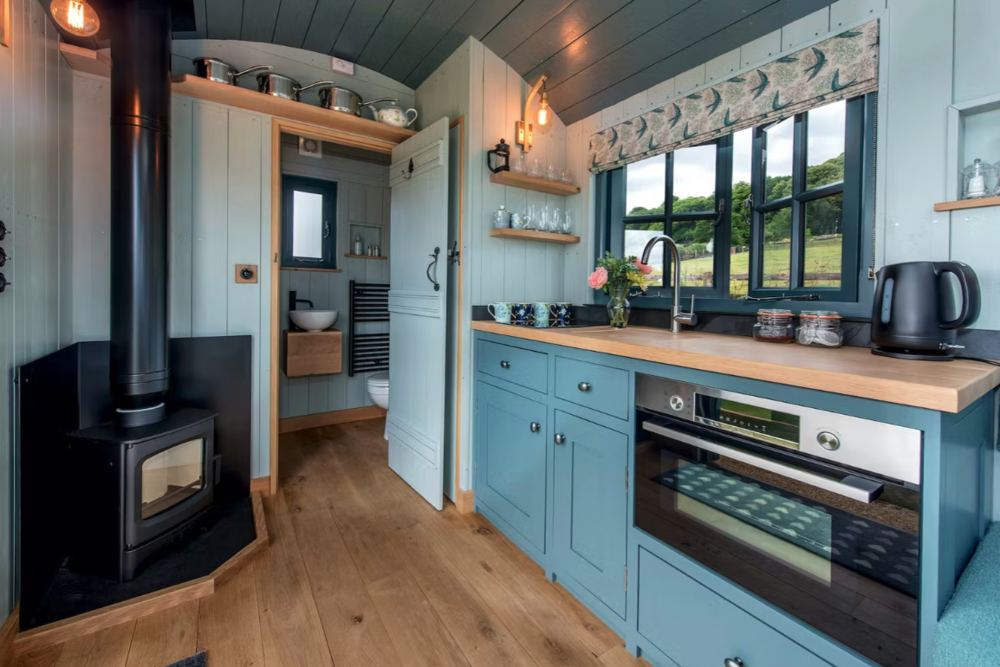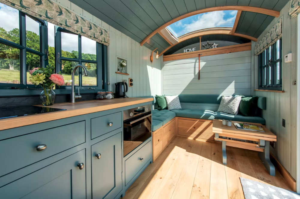 If the idea of glamping appeals then this is for you because inside, these luxury shepherds huts have been designed to give you every comfort we could think of. Like a Shaker style kitchen with an electric oven and grill, a 2 ring hob and a built-in fridge; and a lovely lounge area with comfy seating and a coffee table that converts for dining in a flash. There’s also a very stylish shower room and at night, a pull-down bed with a huge stargazer panel above it – how romantic is that!