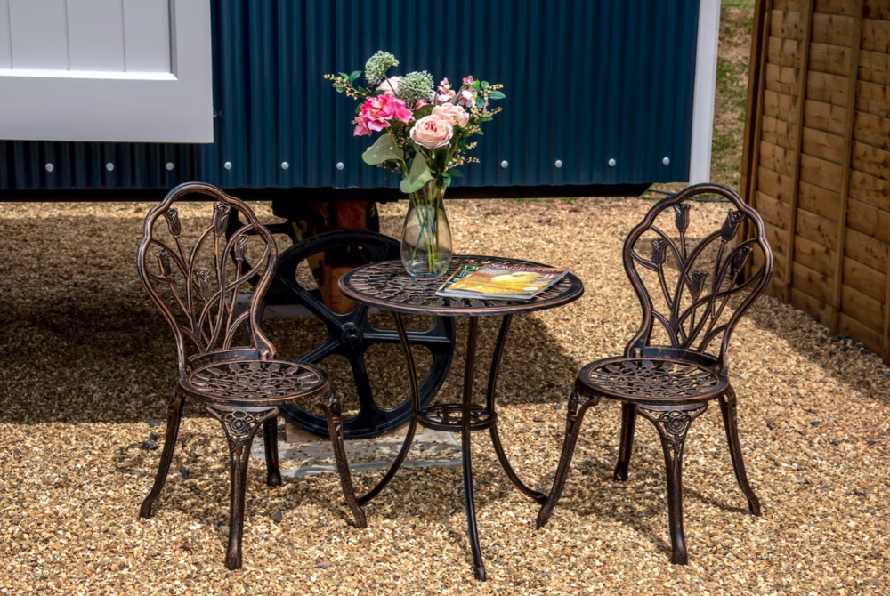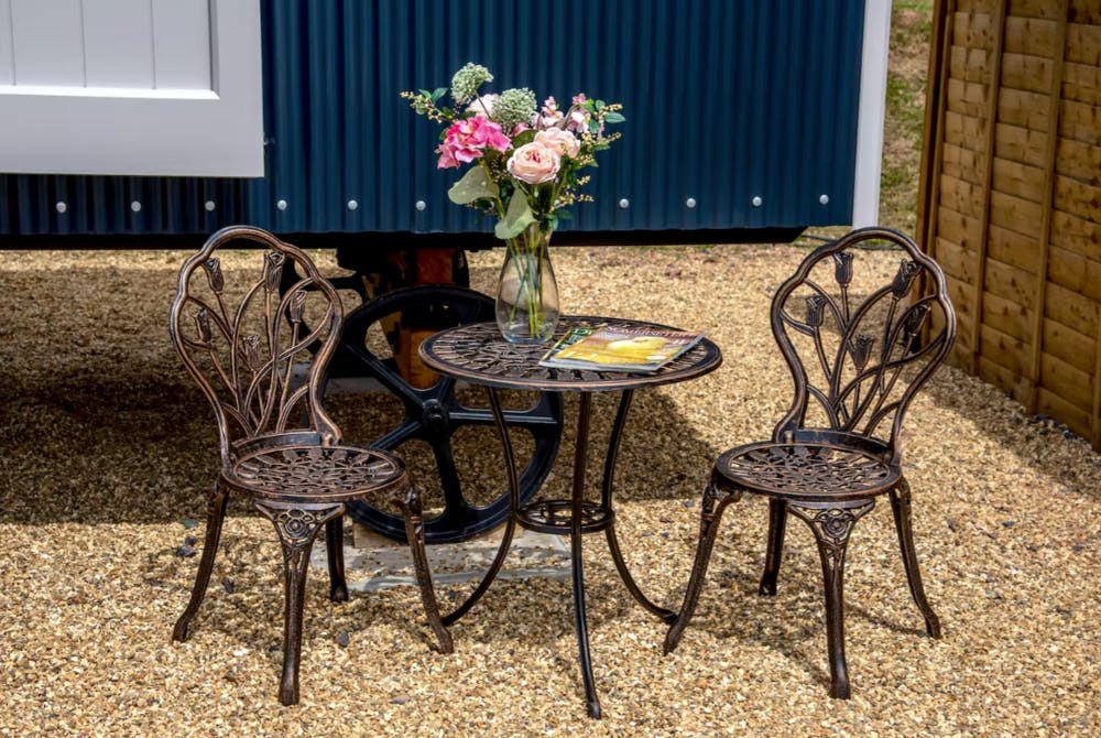 At the moment we’re all plenty warm enough at night, but later in the year when it turns a little chilly there’s underfloor heating to keep you snug and toasty, and a wood-burner to warm your toes by. Outside of each shepherds hut there’s a private garden area with its own electric hot tub, a firepit with a grill for cooking on, and vintage style bistro furniture. Coffee in the sunshine by day, a soak beneath the cotton wool clouds; in the evening, cosy up in blankets, toast marshmallows, slip into the hut tub under a sky full of stars. This is where life slows down, where any tension quickly dissipates.